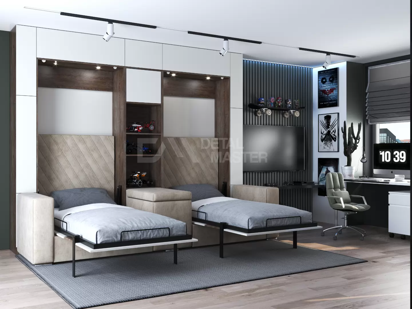 Детская шкаф-кровать с двумя спальными местами  "Twin 2.0" работает на механизме раскладывания собственной разработки "Balance". Кровать раскладывается легким движением руки, превращаясь в полноценное спальное место. Просто потяните за ножку-маятник, которая самостоятельно фиксируется в нужное положение при опускании.