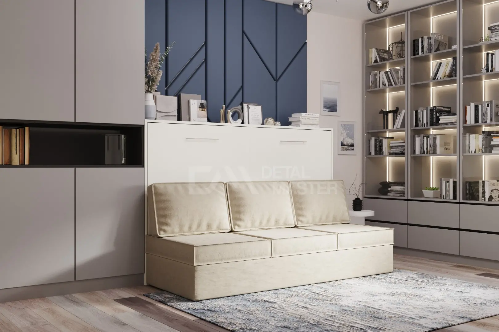 Горизонтальная шкаф-кровать с диваном "Galaxy Start".  Работает на механизме раскладывания собственной разработки "Start". Кровать раскладывается легким движением руки, превращаясь в полноценное спальное место. Просто потяните ее за ручки, расположенные на фасаде и выставите ножки-опоры.